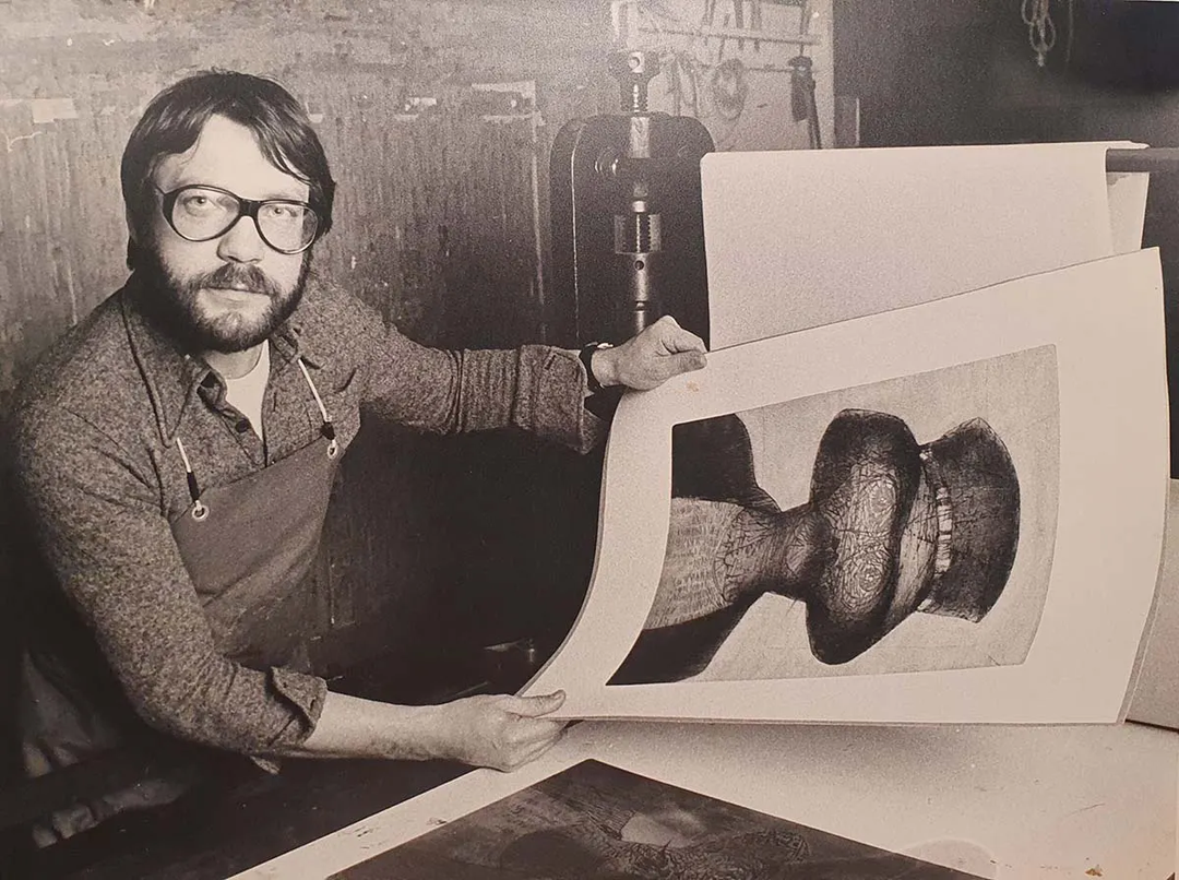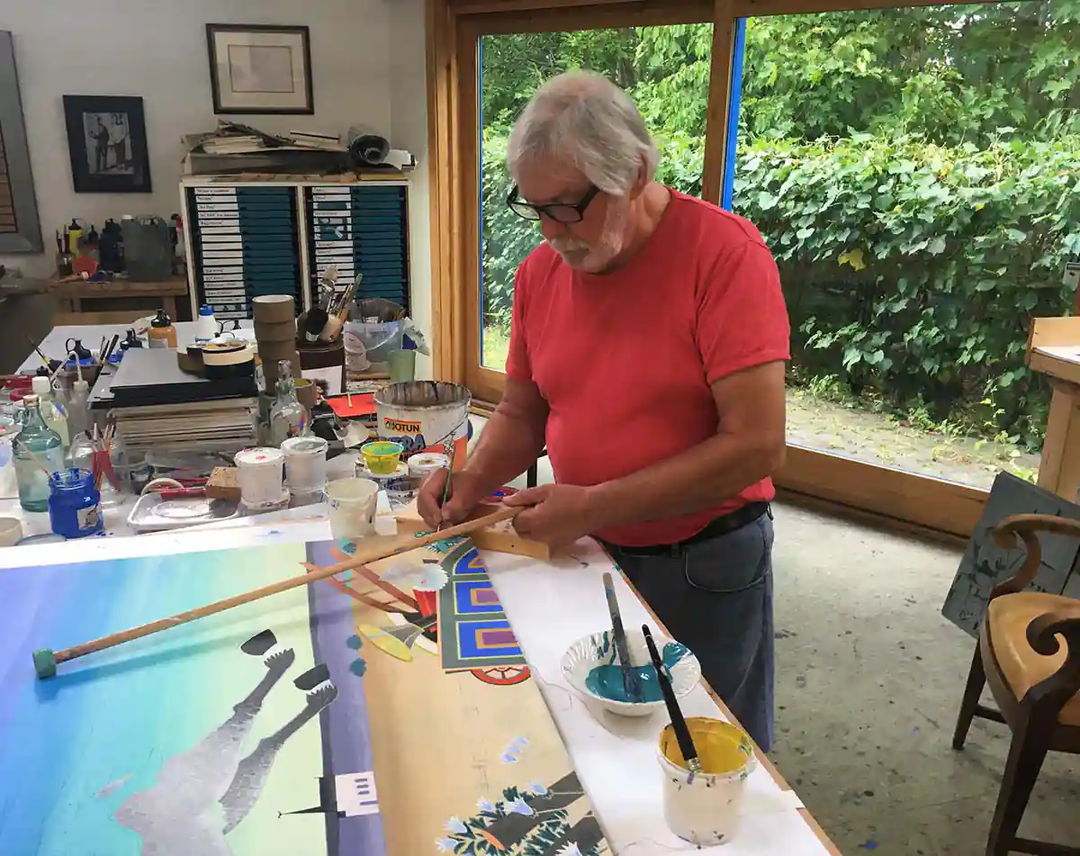 Through experimentation with gold and silver foils, Baker developed his own embossing technique — a process using heavy pressure and high heat to achieve a distinctive visual impact. Within this special field of metal graphics, he is considered an innovator in Norwegian graphic art. His works often contain imaginative, surreal, and humorous elements, expressed in vivid colour and his characteristic embossing technique. He is also known for his material-based artworks using marble, brass, zinc, steel and wood, as well as for oil paintings, drawings, serigraphs, and etchings. Baker’s colourful surrealist imagery — where irony, humour, politics, and narrative symbolism intertwine — has made him one of Norway’s most recognised and best-selling contemporary artists. He invites the viewer to step into the artwork and imagine their own continuation of the story.